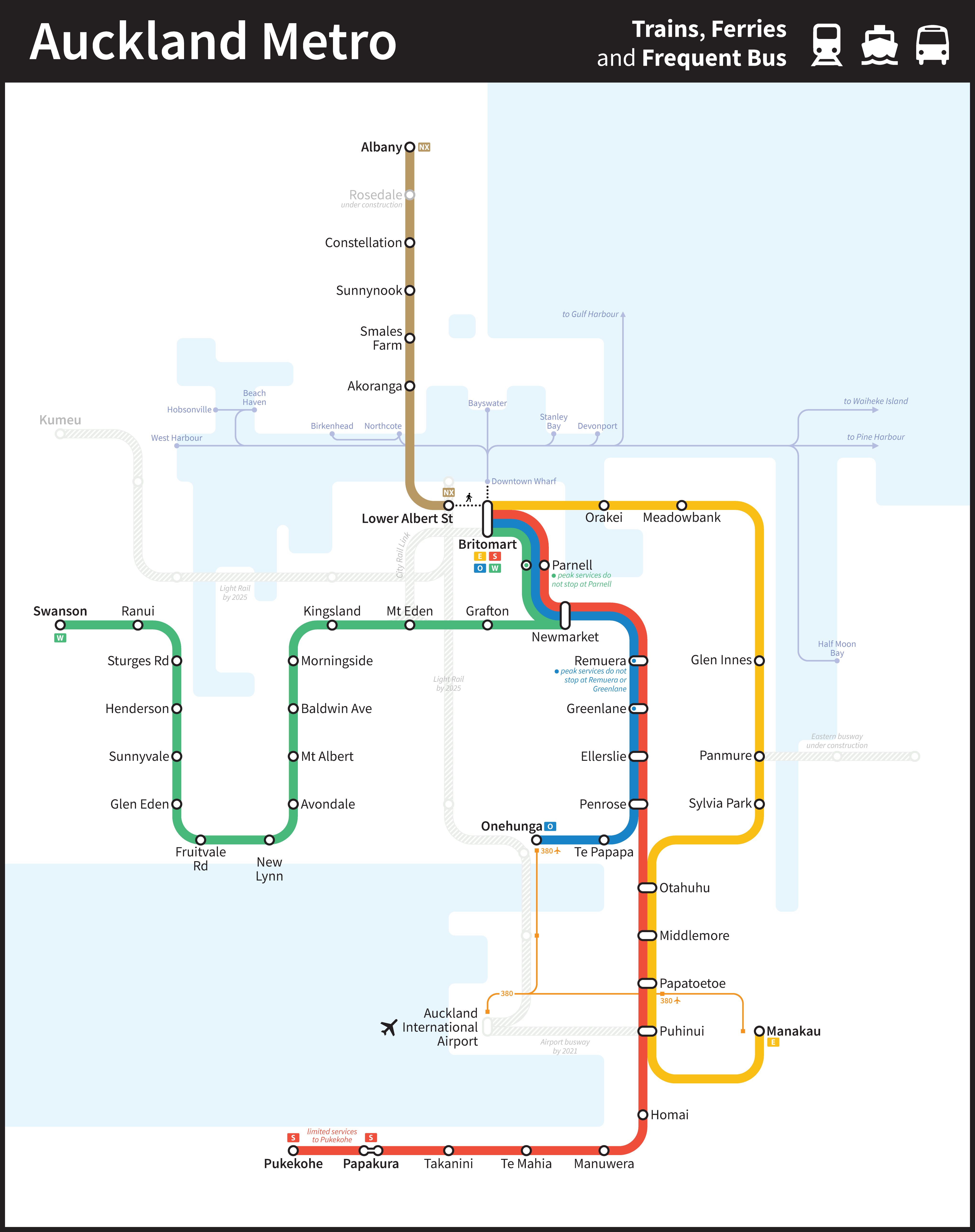I decided to have a crack at one myself. Now, Auckland doesn’t even have a full system map (except this dinky strip map, but that has next to no scope to show future lines), so I’d have to create one from scratch. I’ve only set foot in Auckland a few times but by talking to family that live there and reading blogs like Greater Auckland I gathered an idea of things to include (and some of my own goals). These include: