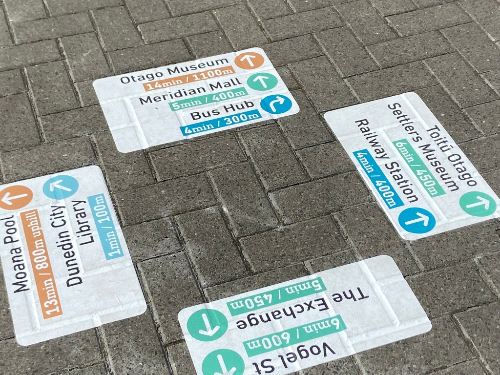 After the map went up, DCC looked into ways to support the navigation and exploration elements. While at Stantec, I developed a simple wayfinding system using the map’s design language and destination hierarchy to be installed as ground markings at key destinations in the city centre.
