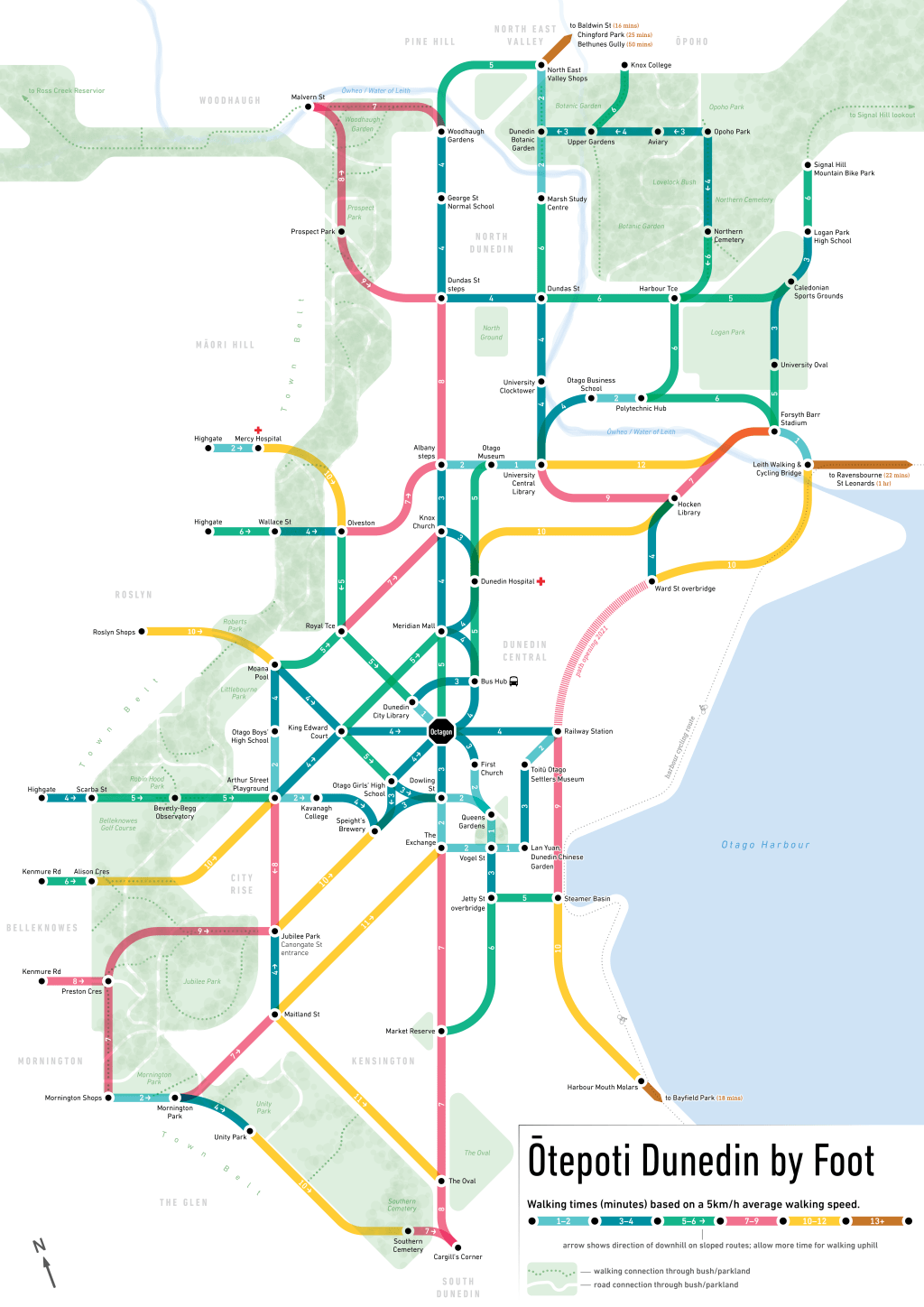 Dunedin City Council (DCC) reached out to me in 2020 (I’ve taken a good while to write this post!) asking for a map that shows off this walkability. They wanted to encourage two behaviour changes: