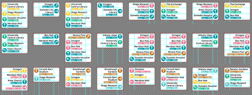 Key pedestrian destinations and routes were selected, and then drawn into a schematic style. The colour relates to the time taken to walk the route (using the same assumed speed as Google Maps, to give consistency if people are cross-referencing between their phone’s directions). The colours and fonts for the map were taken from the new(ish) DCC palette.
